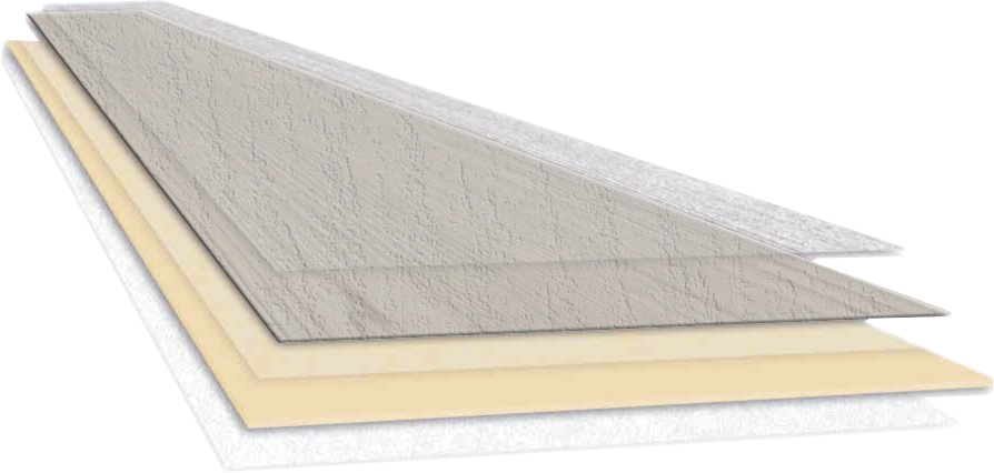 | Composition | PU top layer intense traffic + Acrylic color or UV printing + Decor mineral veneer 1 mm (90% stone powder) + Base layer : ecuran high-performance composite material 4 mm + Backing : Integrated FleeceTEC-System for easy and comfortable installation |