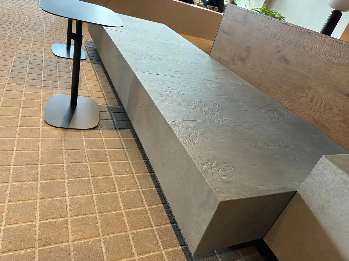 Onto this calibrated foundation, the Rough Concrete mineral veneer introduces a counterpoint of deliberate imperfection. Fine granular reliefs, subtle directional marks, and an irregular micro-texture that feels shaped by process rather than polish — honest, grounded, and quietly powerful. The kind of surface that makes a luxury retail fixture look like a considered act of design, and a bespoke furniture piece feel rooted in something real.