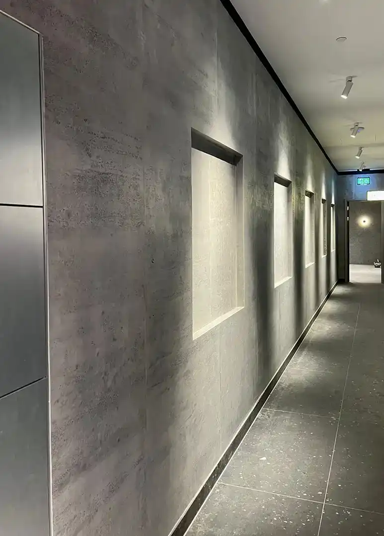 At just 2 kg/m², this roll travertine grey transforms walls, facades, and interiors without structural compromise — cutting cleanly, bending gracefully, and installing with a speed that traditional stone could never match. A2-s1-d0 fire rated. 90% recycled mineral content. Suitable for wet rooms, high-traffic environments, and the most demanding architectural specifications.
